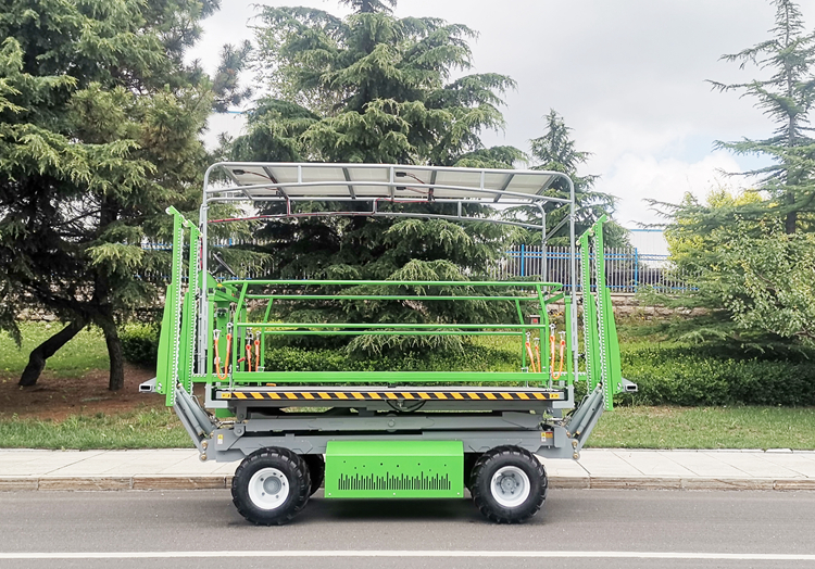 4GP-1200EP electric drive picking operation platform is a full-size picking operation platform developed by Zoomye Company for medium and large-scale park users. The operating surface is 3m x 3m, which can accommodate 6-8 operators+2 500 kg standard fruit baskets at the same time. This platform is the high configuration and high power version of Zoomye 1200 series platform. In addition to the high cost performance, high structural strength, high reliability, high durability, high load, high efficiency, high compatibility In addition to the features of easy maintenance, Zoomye Company has equipped it with a large capacity lithium battery pack with BMS management system (battery capacity 200Ah), and equipped it with an AC motor and AC control system using CAN bus communication control, so that the performance of the motor and battery pack has been very well adjusted. In order to improve the driving performance on the ramp, it has also added a steep descent function for the model, It still has excellent controllability when working with full load on 20% ramp, so the operator can take it easy!