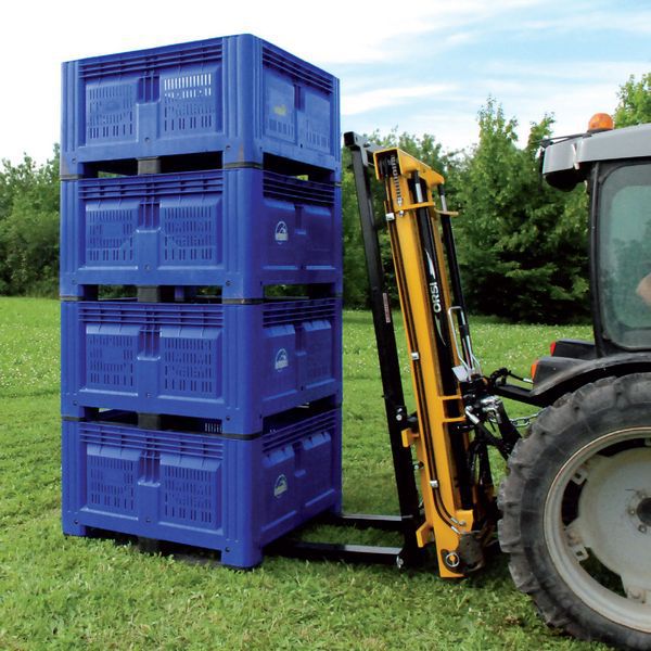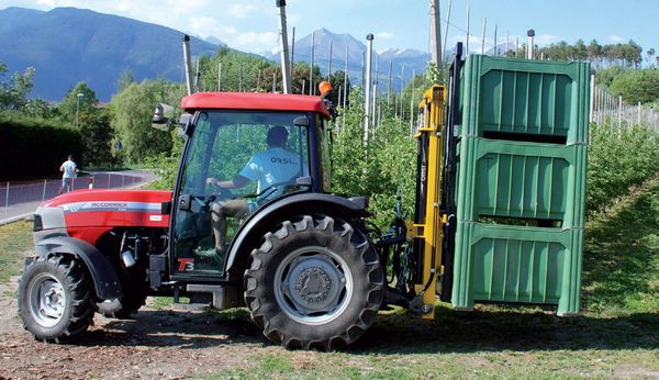 背負(fù)式叉車 是 為解決果園山地越野工況下 轉(zhuǎn)運(yùn)果筐和其它果園物資而研發(fā)的與果園拖拉機(jī)配合使用的果園轉(zhuǎn)運(yùn)裝備。叉車安裝在拖拉機(jī)后三點(diǎn)懸掛上,駕駛員通過操作液壓控制閥來(lái)控制叉車動(dòng)作,叉車具有舉升、側(cè)移、傾斜、鎖筐等功能,配備了舉升油缸2根、傾斜油缸1根、側(cè)移油缸1根、鎖緊油缸2根共計(jì)6根??梢淮闻e升多個(gè)果箱,方便果園果箱等物資的搬運(yùn),節(jié)省人力物力。果園用戶無(wú)需單獨(dú)購(gòu)買山地叉車,把該背負(fù)式叉車直接安裝到拖拉機(jī)上即可實(shí)現(xiàn)山地搬運(yùn)作業(yè),拖拉機(jī)可到之處都可以使用。特別適合果園采摘后的果箱的轉(zhuǎn)運(yùn)工作。