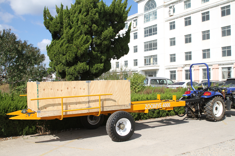 The chassis lifting fruit basket trailer is a smart transport equipment developed by CEA to solve the problem of modern orchard turnover of large standard fruit baskets (such as transportation and distribution of empty fruit baskets and recycling of fruit baskets full of fruits). The trailer is used together with the tractor. The trailer axle can be lifted and lowered under the action of the hydraulic oil cylinder (the lifting range can be customized). The duckbill fork head at the end of the frame longitudinal beam with the hydraulic hinge device can fit perfectly to the ground under the action of the oil cylinder, and it is easy to fork into the bottom of the fruit basket. At this time, the fruit basket is hinged to the truck by the hydraulic hinge. The trailer can load 3-5 standard fruit baskets at a time (the length can be customized), which is a good way to transfer fruit baskets other than backpack forklift.